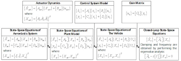 Next, the aeroelastic state space equation is combined with the state space equation of the actuator model to construct the state space equation of the plant model. This plant model is then combined with the state space equation of the control system to form the state space equation of the vehicle model. The control system can be represented by a serious of single-input-single-output (SISO) and/or multi-input-multi-output (MIMO) control elements. An upstream control element and a downstream control element can be connected by either a fixed gain connection or a variable gain connection. Finally, the closed-loop state space equation can be obtained by applying the gain matrix to the vehicle system. Damping and frequency of the closed-loop system at each density and velocity pair can be computed by solving the eigenvalues of the closed-loop system matrix. Meanwhile, gain margin and phase margin of the closed-loop system also can be evaluated. Bode diagrams also can be generated.