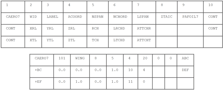 ZAERO utilizes the bulk data input format, similar to that of NASTRAN and ASTROS. This type of input format has the advantage of: (a) minimizing the user learning curve, (b) relieving user input burden, and (c) automated input error detection. An example of this type of input format is shown below.