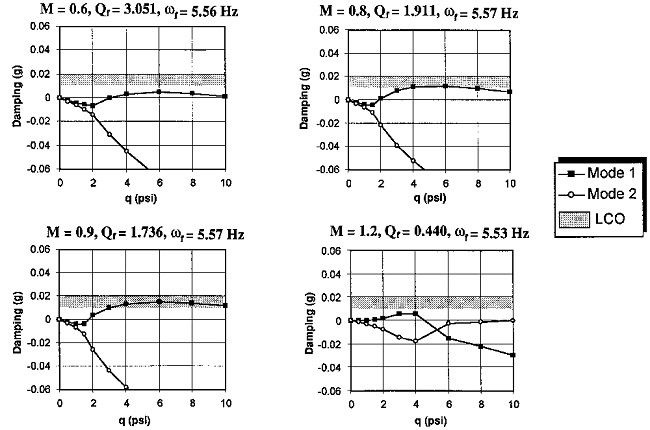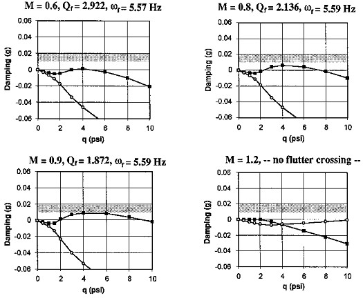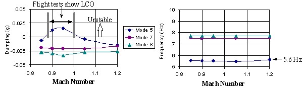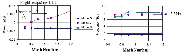 - Unstable damping of Case 1 below approximately ranges from M = 0.85 to 1.0 with a frequency of 5.6 Hz which correlates very well with the flight test data.