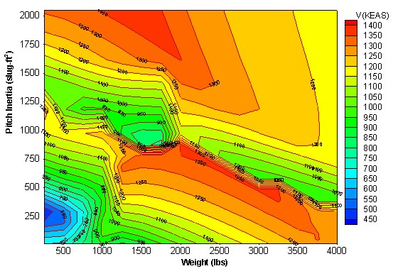- Ease for post-processing using off-the-shelf graphic tool such as Tecplot. Shown in the figure below is the flutter speed vs. various pitch inertia and weight diagram of the store.