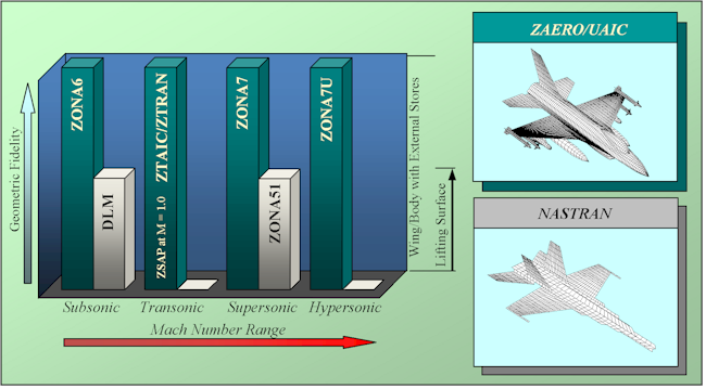 The applicable Mach number range of these codes and their geometric fidelity in contrast to the Doublet Lattice Method (DLM) and ZONA51 (currently the Aero Options I/II in MSC.Nastran) are shown in the following figure.